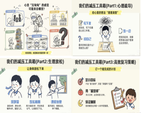 各班级紧随其后,开展了“轻松应考,告别焦虑”主题班会。班会伊始,“焦虑Emoji猜猜乐”等趣味游戏迅速点燃了课堂氛围,同学们在欢声笑语中放下拘谨,主动分享自己面对考试的紧张与担忧。班主任借助“焦虑自测小问卷”,引导学生了解自身焦虑程度,并通过“焦虑曲线”图解,生动阐释了“适度焦虑更有助于高效复习”的道理。在“减压妙招分享会”环节,同学们各抒己见,分享了制定复习计划表、和好朋友倾诉烦恼等实用方法,在交流中互相启发,凝聚起携手减压的共识。